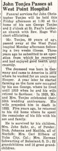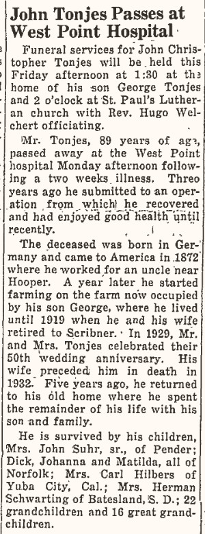 Johann Christoph Tönjes – Traueranzeige Zum Vergrößern bitte anklicken Quelle: The Scribner Rustler vom 11. Februar 1943